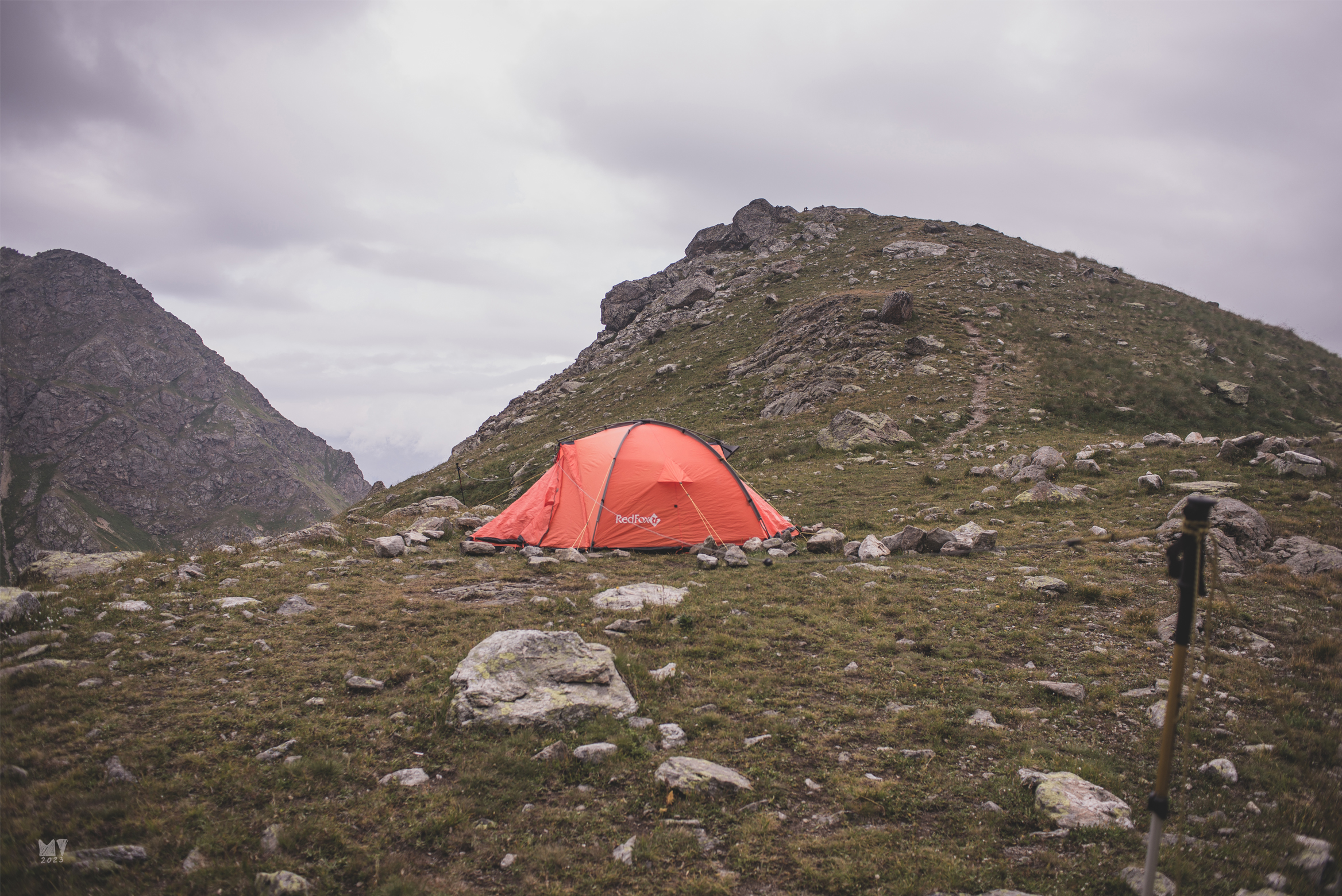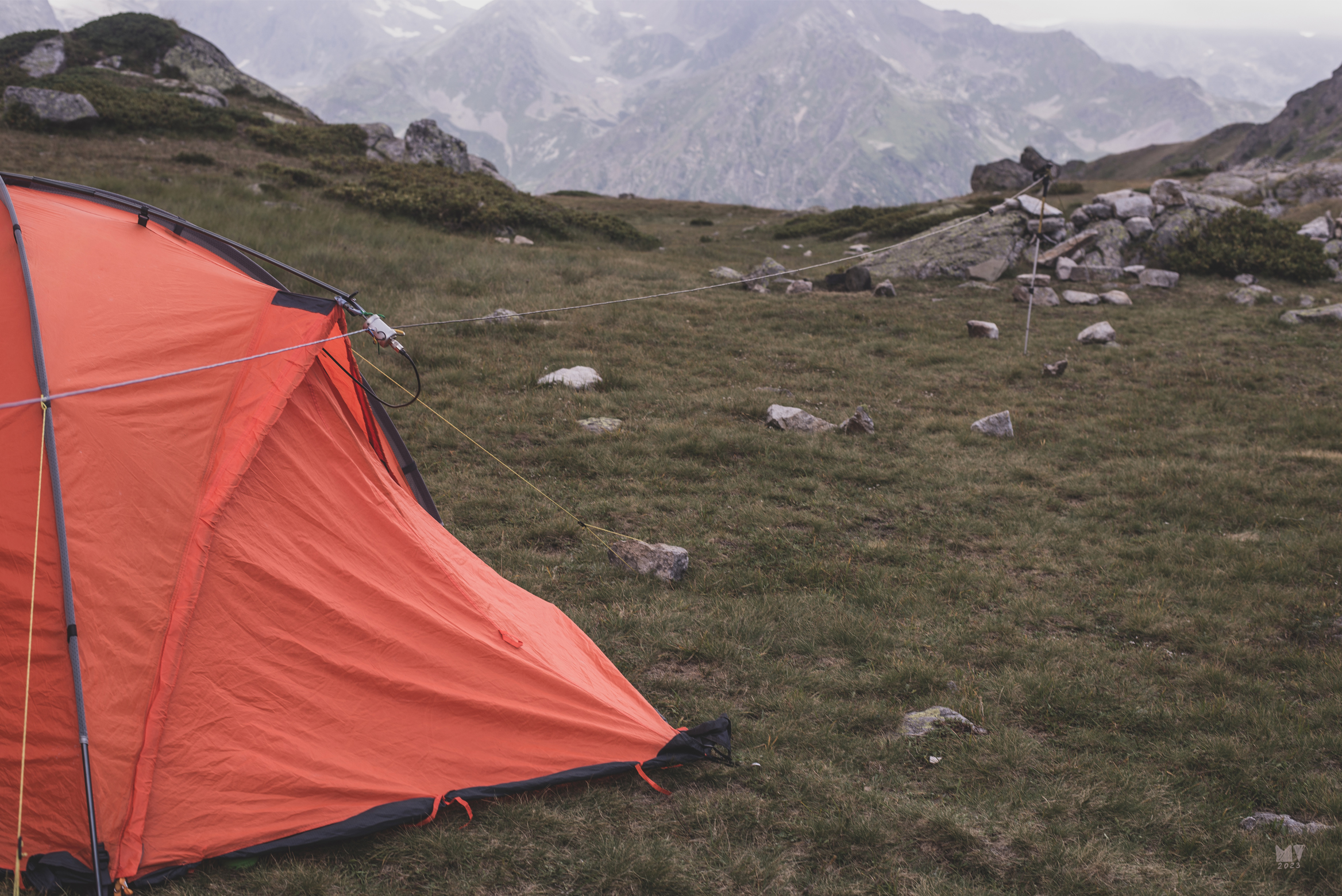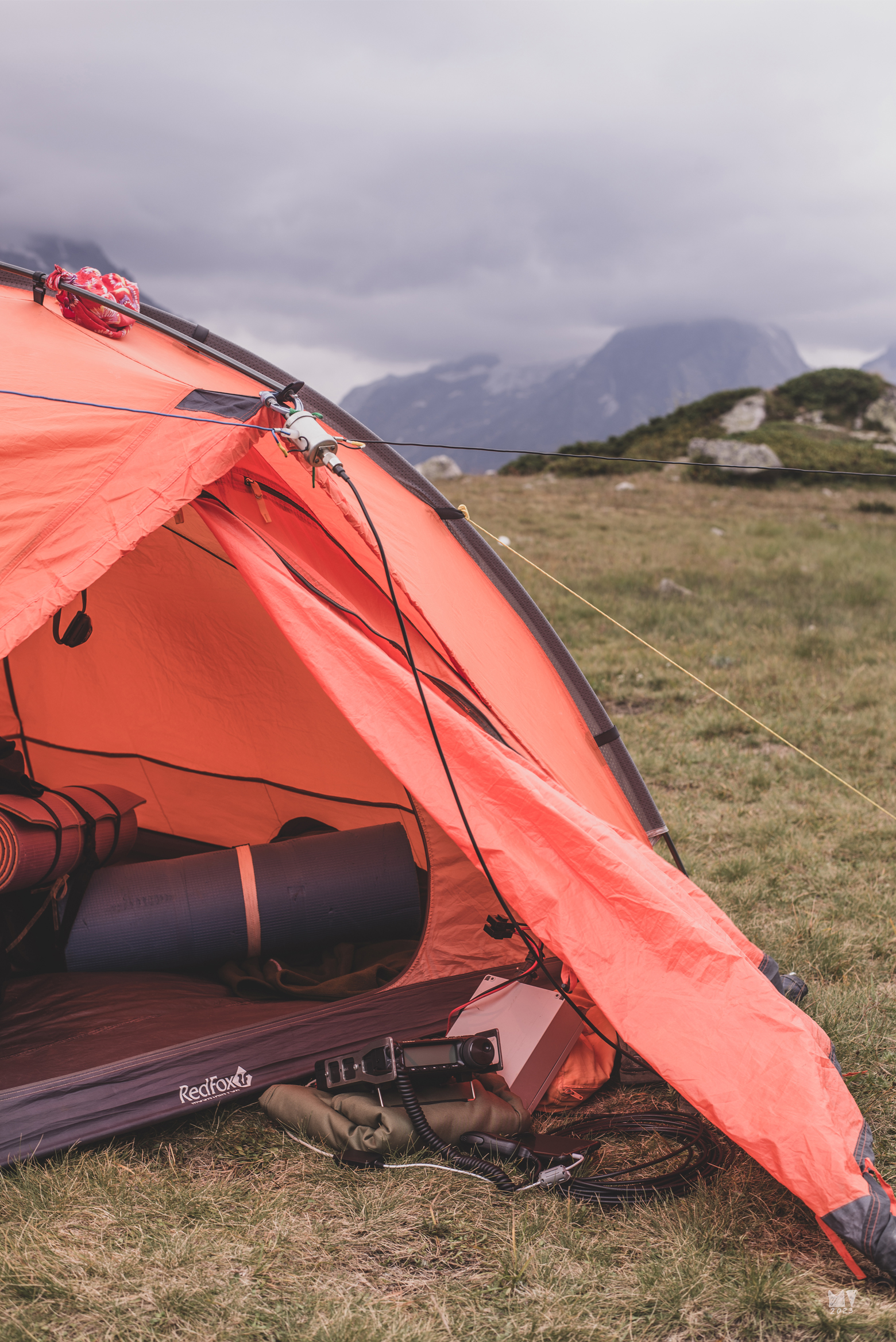 Поход проходил в горной местности, а это накладывает ограничения на использование технических устройств. Наши стоянки находились на высотах от 2000 до 2800 метров, для Кавказских гор это соответствует субальпийскому и альпийскому поясам. Растительность в виде кустарников, а тем более деревьев практически полностью отсутствует. Вот первое ограничение по высоте подъёма антенны — не выше чем искусственно созданные опоры. Место под стоянку может быть ограниченно рельефом, а это ограничение на размер антенны, она должна быть как можно компактнее. Так же ограничение на размер антенны наложила сама физика распространения радиоволн. Летом с наступлением темноты уверенный приём на расстояниях около 1300 км (Архыз — Москва) возможен на частотах в районе 7 МГц, а это как раз сорокаметровый любительский диапазон. В таком случае — длинна диполя составляет около 21 метра. В моём случае, это траповая антенна, она чуть короче. Имеем следующее - палатка стоит в удобном, но ограниченном месте, где надо разместить провод антенны длиной 20 метров. Оптимально размещать антенну не в одну сторону от палатки, а в обе, в таком случае экономятся размеры и вес кабеля от центра «запитки» антенны до рабочего места в палатке, а также сокращается радиус досягаемости краёв антенны до тех самых 10 метров. Теперь разберёмся с искусственными опорами. Можно нести с собой мачту, выполненную из удочки, но это дополнительный вес. Да, можно возразить: «Неся тяжёлую радиостанцию, лёгкая углепластиковая удочка не в счёт». Спорю - в счёт, а ещё лучше и радиостанцию как можно более компактную и лёгкую. Поэтому, искусственные опоры для краёв антенны были выполнены из треккинговых палок, оттяжка антенны в виде петли крепилась за палку и растягивалась двумя камнями. На фото это отражено, такая конструкция уверенно стоит на одном месте и удерживается в трёх направлениях. Центральная точка антенны крепилась карабином за конёк палатки.