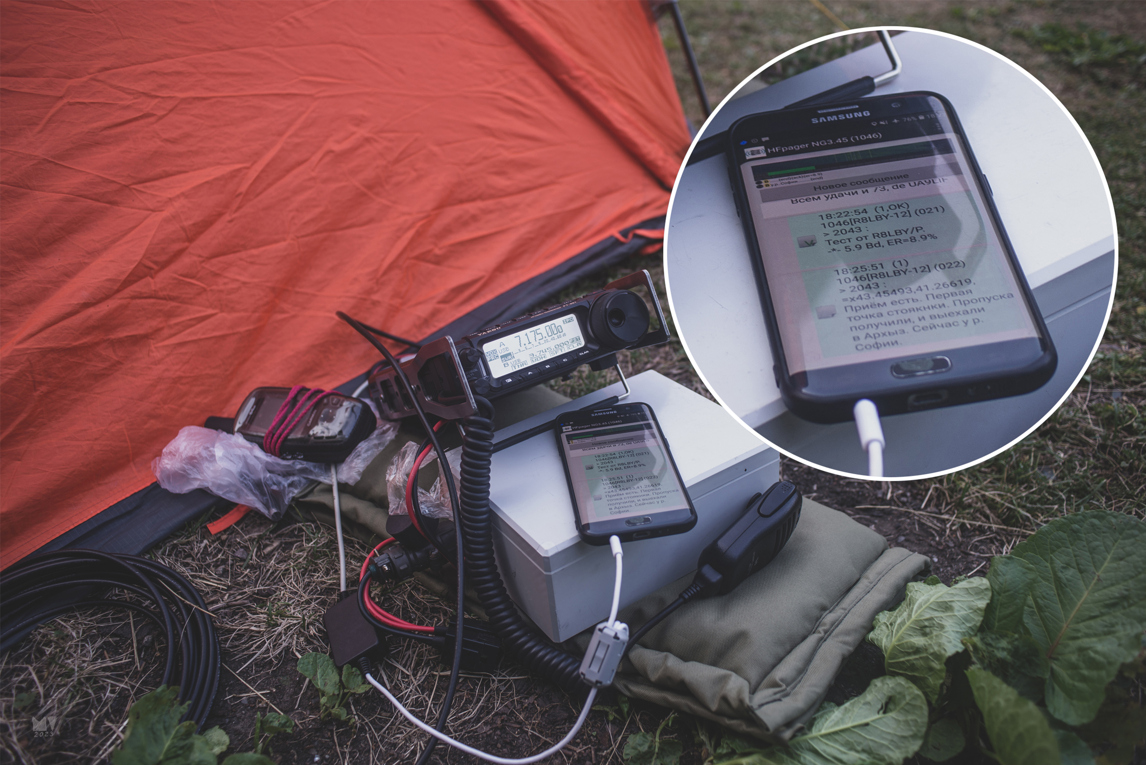 Оборудование: трансивер FT-891, антенна D2040, аккумулятор LiFePO4 (ок. 10 Ампер-часов), смартфон с ПО «HFpager».