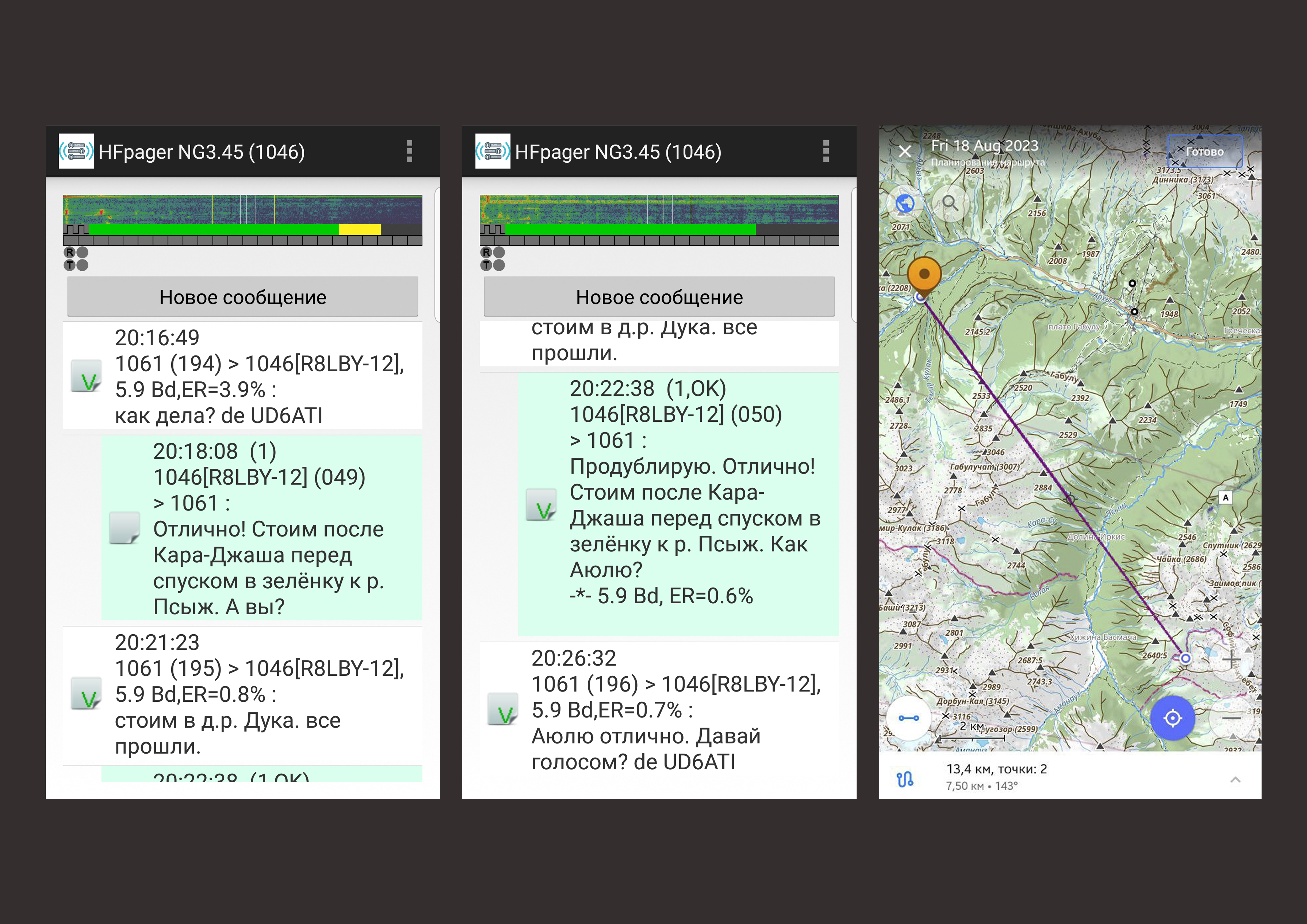 Вторая часть сеансов была с ещё одной туристской группой из нашего района, Юрий UD6ATI был от нас в долине соседней реки. КВпейджером связались, процент ошибок в канале связи был небольшой и вся информация декодировалась полностью, а вот голосовая связь у нас не сложилась. Из-за мощных сигналов соседних по частоте станций сигнал Юрия звучал очень слабо и пропадал, трудно вычленять смысл сообщения из обрывков отдельных слов. Практически весь диапазон вечером был забит дальними станциями.