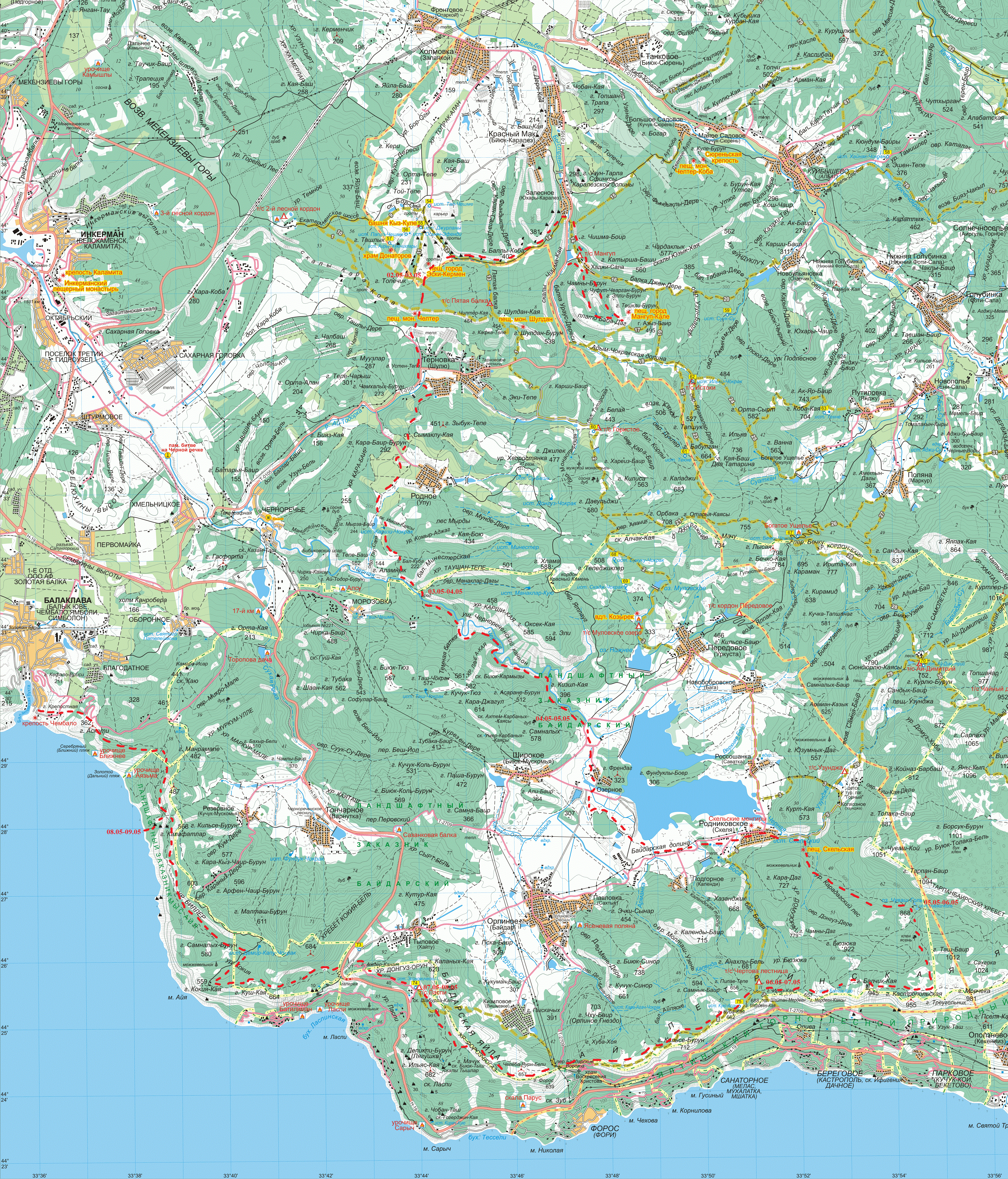 С. Ходжа-Сала - Плато Баба-Даг - пещерный город Мангуп-кале – с. Залесное - пещерный город Эски-Кермен – монастырь Челтер-Коба – с. Терновка – Партизанская поляна – каньон р. Чёрная (н/к) – мост через р. Чёрная – Байдарская долина – с. Озёрное – с. Родниковое – Карадагский лес – оз. Чуваш-Голь - Ай-Петринская яйла – г. Таш-Баир – пер. Чёртова Лестница – пер. Байдарские ворота –Байдарская яйла - г. Ильяс-Кая – пер. Ласпинский – г. Куш-Кая – г. Кокия-Кая – хребет Биллер – пляж Инжир - пер. Аскети (н/к) – г. Балакалава.
